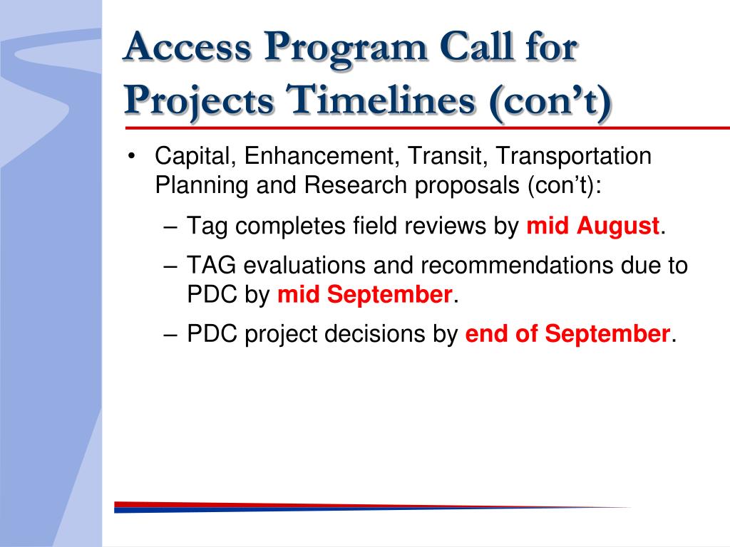 Access Program Call for Projects Timelines (con’t) • Capital, Enhancement, Transit, Transportation Planning and Research proposals (con’t): • Tag completes field reviews by mid August. • TAG evaluations and recommendations due to PDC by mid September. • PDC project decisions by end of September.