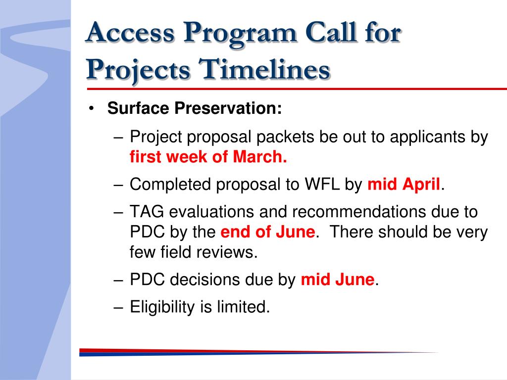 Access Program Call for Projects Timelines • Surface Preservation: • Project proposal packets be out to applicants by first week of March. • Completed proposal to WFL by mid April. • TAG evaluations and recommendations due to PDC by the end of June. There should be very few field reviews. • PDC decisions due by mid June. • Eligibility is limited.