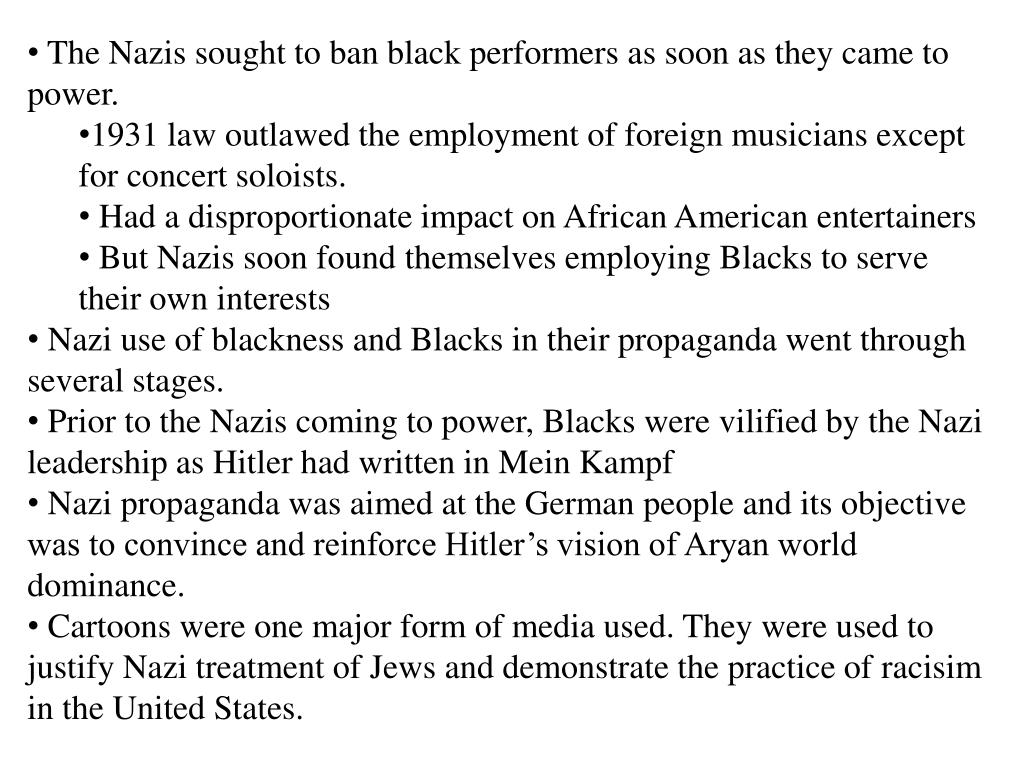 The Nazis sought to ban black performers as soon as they came to power. • 1931 law outlawed the employment of foreign musicians except for concert soloists. • Had a disproportionate impact on African American entertainers • But Nazis soon found themselves employing Blacks to serve their own interests • Nazi use of blackness and Blacks in their propaganda went through several stages. • Prior to the Nazis coming to power, Blacks were vilified by the Nazi leadership as Hitler had written in Mein Kampf • Nazi propaganda was aimed at the German people and its objective was to convince and reinforce Hitler’s vision of Aryan world dominance. • Cartoons were one major form of media used. They were used to justify Nazi treatment of Jews and demonstrate the practice of racisim in the United States.