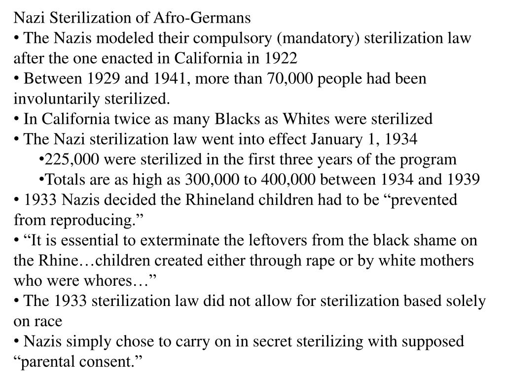 Nazi Sterilization of Afro-Germans • The Nazis modeled their compulsory (mandatory) sterilization law after the one enacted in California in 1922 • Between 1929 and 1941, more than 70,000 people had been involuntarily sterilized. • In California twice as many Blacks as Whites were sterilized • The Nazi sterilization law went into effect January 1, 1934 • 225,000 were sterilized in the first three years of the program • Totals are as high as 300,000 to 400,000 between 1934 and 1939 • 1933 Nazis decided the Rhineland children had to be “prevented from reproducing.” • “It is essential to exterminate the leftovers from the black shame on the Rhine…children created either through rape or by white mothers who were whores…” • The 1933 sterilization law did not allow for sterilization based solely on race • Nazis simply chose to carry on in secret sterilizing with supposed “parental consent.”