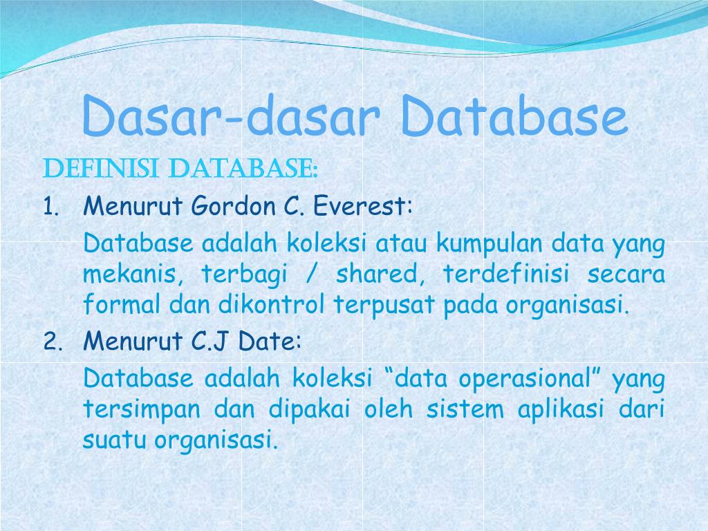 Dasar-dasar Database Definisi database: • Menurut Gordon C. Everest: Database adalahkoleksiataukumpulan data yang mekanis, terbagi / shared, terdefinisisecara formal dandikontrolterpusatpadaorganisasi. • Menurut C.J Date: Database adalahkoleksi “data operasional” yang tersimpandandipakaiolehsistemaplikasidarisuatuorganisasi.