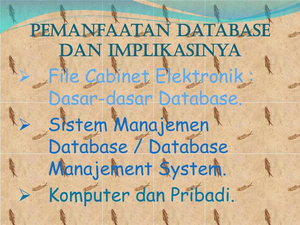 Pemanfaatan Database dan Implikasinya • File Cabinet Elektronik :Dasar-dasar Database. • Sistem Manajemen Database / Database Manajement System. • Komputer dan Pribadi.