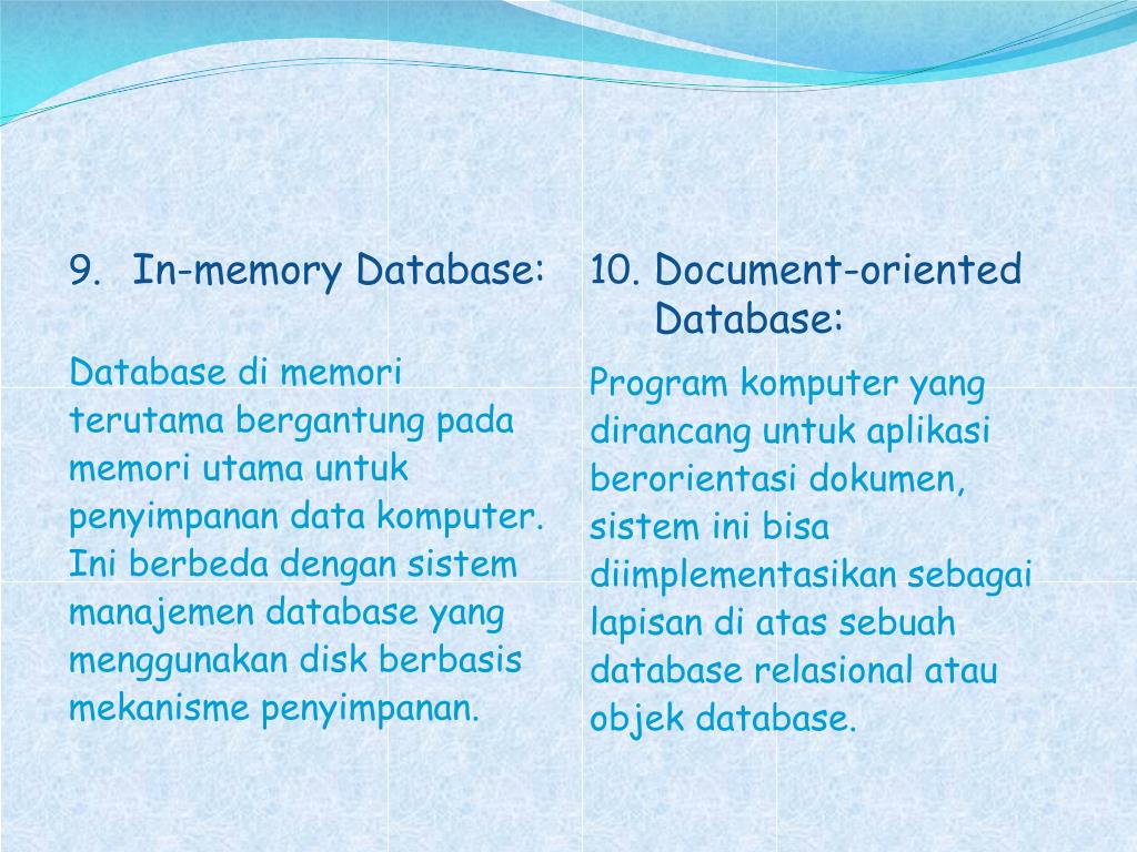 In-memory Database: Database dimemoriterutamabergantungpadamemoriutamauntukpenyimpanan data komputer. Iniberbedadengansistemmanajemen database yang menggunakan disk berbasismekanismepenyimpanan. • Document-oriented Database: Program komputer yang dirancanguntukaplikasiberorientasidokumen, sisteminibisadiimplementasikansebagailapisandiatassebuah database relasionalatauobjek database.