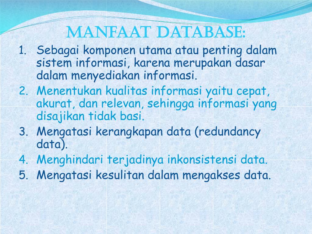 manfaat database: • Sebagaikomponenutamaataupentingdalamsisteminformasi, karenamerupakandasardalammenyediakaninformasi. • Menentukankualitasinformasiyaitucepat, akurat, danrelevan, sehinggainformasi yang disajikantidakbasi. • Mengatasikerangkapan data (redundancy data). • Menghindariterjadinyainkonsistensi data. • Mengatasikesulitandalammengakses data.