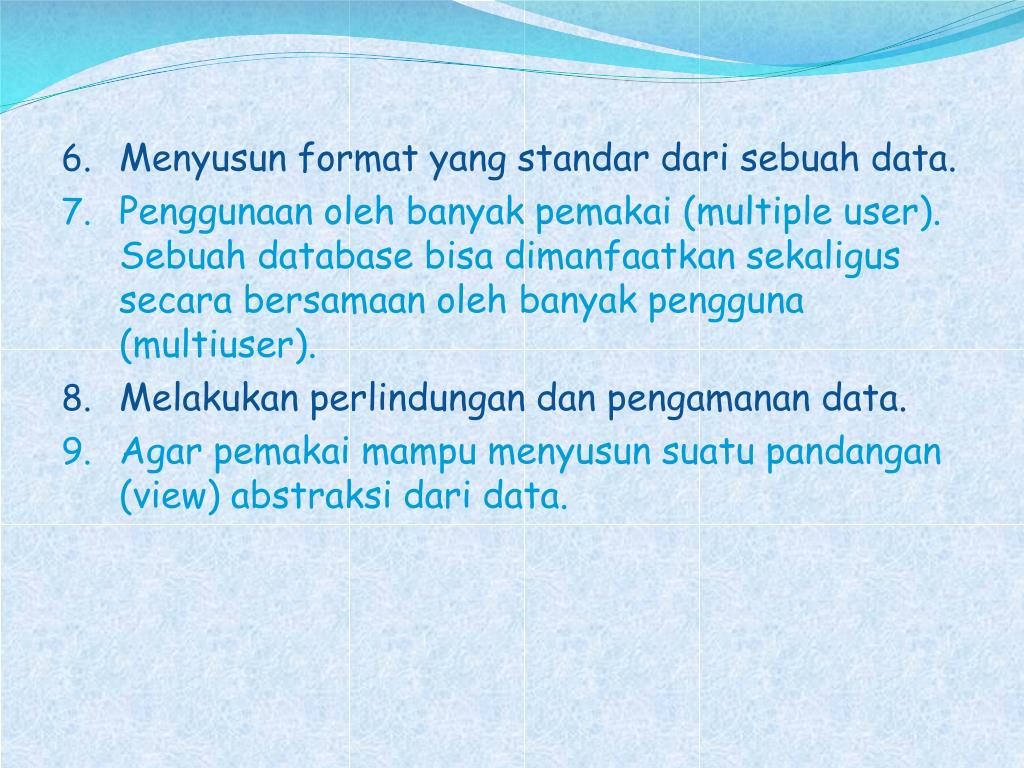 Menyusun format yang standardarisebuah data. • Penggunaanolehbanyakpemakai (multiple user). Sebuah database bisadimanfaatkansekaligussecarabersamaanolehbanyakpengguna (multiuser). • Melakukanperlindungandanpengamanan data. • Agar pemakaimampumenyusunsuatupandangan (view) abstraksidari data.