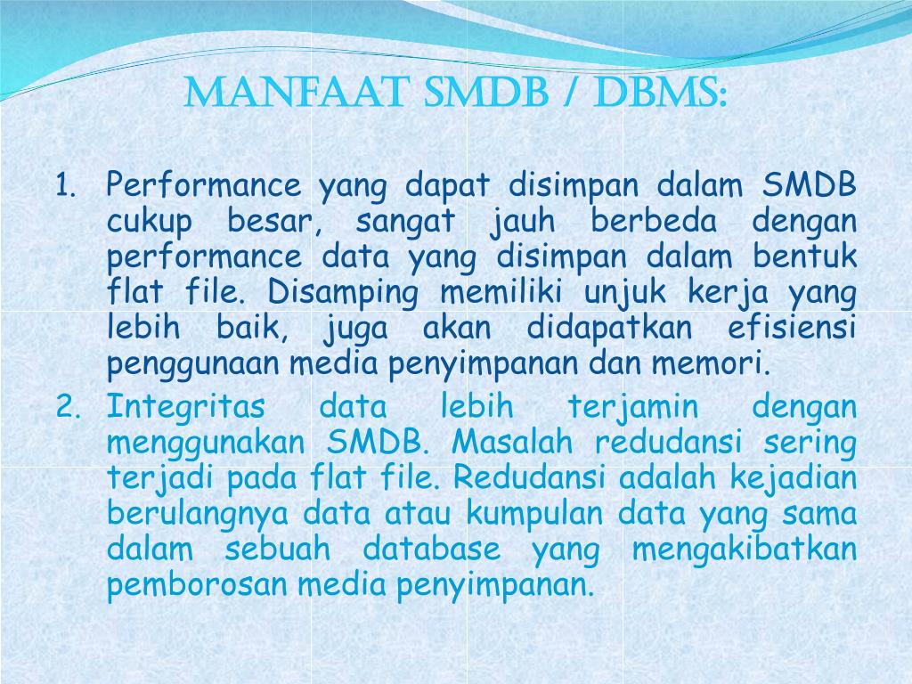 Manfaatsmdb / dbms: • Performance yang dapatdisimpandalam SMDB cukupbesar, sangatjauhberbedadengan performance data yang disimpandalambentuk flat file. Disampingmemilikiunjukkerja yang lebihbaik, jugaakandidapatkanefisiensipenggunaan media penyimpanandanmemori. • Integritas data lebihterjamindenganmenggunakan SMDB. Masalahredudansiseringterjadipada flat file. Redudansiadalahkejadianberulangnya data ataukumpulan data yang samadalamsebuah database yang mengakibatkanpemborosan media penyimpanan.