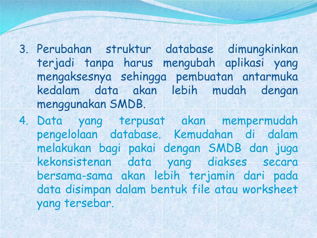 Perubahanstruktur database dimungkinkanterjaditanpaharusmengubahaplikasi yang mengaksesnyasehinggapembuatanantarmukakedalam data akanlebihmudahdenganmenggunakan SMDB. • Data yang terpusatakanmempermudahpengelolaan database. Kemudahandidalammelakukanbagipakaidengan SMDB danjugakekonsistenan data yang diaksessecarabersama-samaakanlebihterjamindaripada data disimpandalambentuk file atau worksheet yang tersebar.