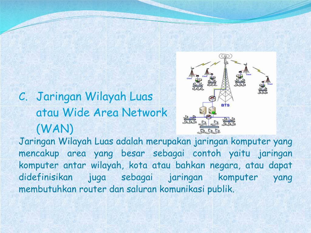 Jaringan Wilayah Luas atau Wide Area Network (WAN) Jaringan Wilayah Luasadalahmerupakanjaringankomputer yang mencakup area yang besarsebagaicontohyaitujaringankomputerantarwilayah, kotaataubahkannegara, ataudapatdidefinisikanjugasebagaijaringankomputer yang membutuhkan router dansalurankomunikasipublik.