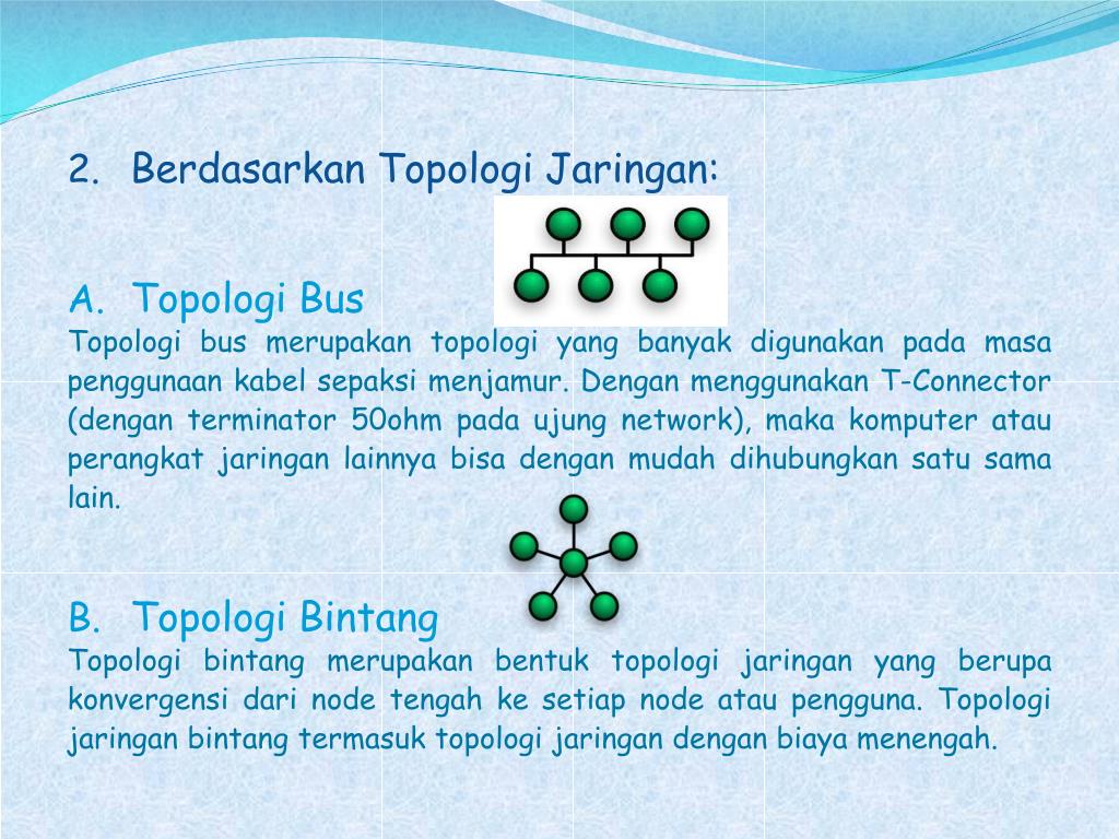 BerdasarkanTopologiJaringan: • Topologi Bus Topologi bus merupakantopologi yang banyakdigunakanpadamasapenggunaankabelsepaksimenjamur. Denganmenggunakan T-Connector (dengan terminator 50ohm padaujung network), makakomputeratauperangkatjaringanlainnyabisadenganmudahdihubungkansatusama lain. • TopologiBintang Topologibintangmerupakanbentuktopologijaringan yang berupakonvergensidari node tengahkesetiap node ataupengguna. Topologijaringanbintangtermasuktopologijaringandenganbiayamenengah.
