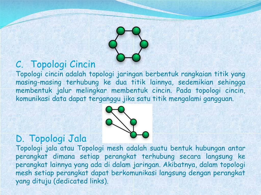 TopologiCincin Topologicincinadalahtopologijaringanberbentukrangkaiantitik yang masing-masingterhubungkeduatitiklainnya, sedemikiansehinggamembentukjalurmelingkarmembentukcincin. Padatopologicincin, komunikasi data dapatterganggujikasatutitikmengalamigangguan. • TopologiJala TopologijalaatauTopologi mesh adalahsuatubentukhubunganantarperangkatdimanasetiapperangkatterhubungsecaralangsungkeperangkatlainnya yang adadidalamjaringan. Akibatnya, dalamtopologi mesh setiapperangkatdapatberkomunikasilangsungdenganperangkat yang dituju (dedicated links).