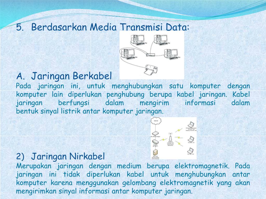 Berdasarkan Media Transmisi Data: • JaringanBerkabel Padajaringanini, untukmenghubungkansatukomputerdengankomputer lain diperlukanpenghubungberupakabeljaringan. Kabeljaringanberfungsidalammengiriminformasidalambentuksinyallistrikantarkomputerjaringan. • JaringanNirkabel Merupakanjaringandengan medium berupaelektromagnetik. Padajaringaninitidakdiperlukankabeluntukmenghubungkanantarkomputerkarenamenggunakangelombangelektromagnetik yang akanmengirimkansinyalinformasiantarkomputerjaringan.