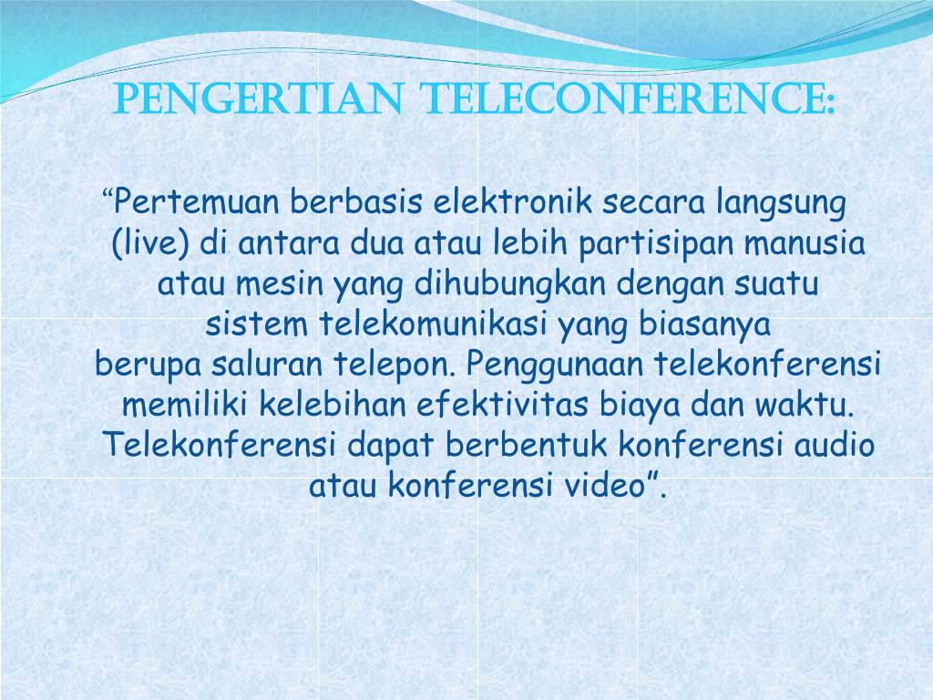 Pengertian Teleconference: “Pertemuanberbasiselektroniksecaralangsung (live) diantaraduaataulebihpartisipanmanusiaataumesin yang dihubungkandengansuatusistemtelekomunikasi yang biasanyaberupasalurantelepon. Penggunaantelekonferensimemilikikelebihanefektivitasbiayadanwaktu. Telekonferensidapatberbentukkonferensi audio ataukonferensi video”.