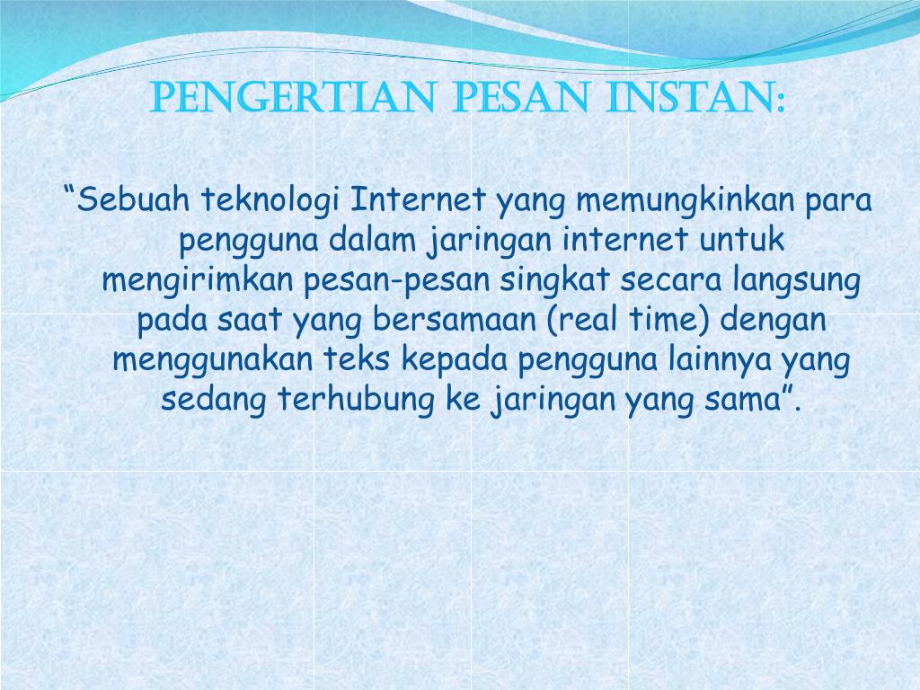 Pengertianpesaninstan: “Sebuahteknologi Internet yang memungkinkanparapenggunadalamjaringan internet untukmengirimkanpesan-pesansingkatsecaralangsungpadasaat yang bersamaan (real time) denganmenggunakantekskepadapenggunalainnya yang sedangterhubungkejaringan yang sama”.