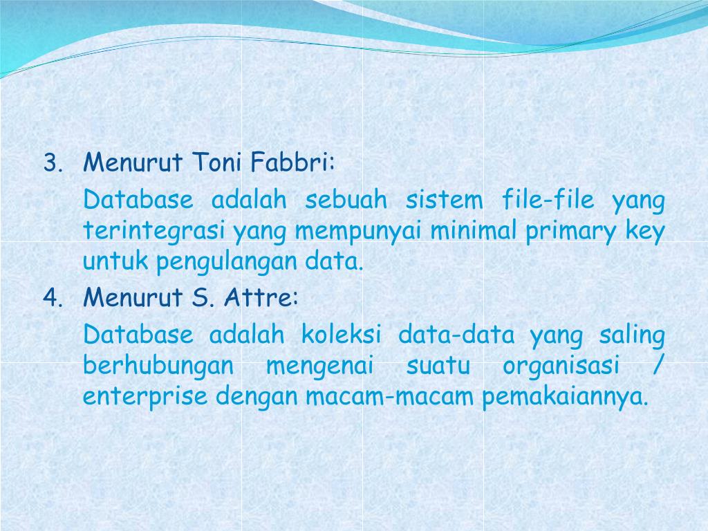 Menurut Toni Fabbri: Database adalahsebuahsistem file-file yang terintegrasi yang mempunyai minimal primary key untukpengulangan data. • Menurut S. Attre: Database adalahkoleksi data-data yang salingberhubunganmengenaisuatuorganisasi / enterprise denganmacam-macampemakaiannya.