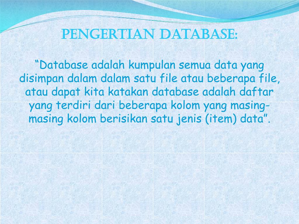 Pengertian database: “Database adalahkumpulansemua data yang disimpandalamdalamsatu file ataubeberapa file, ataudapatkitakatakan database adalahdaftar yang terdiridaribeberapakolom yang masing-masingkolomberisikansatujenis (item) data”.