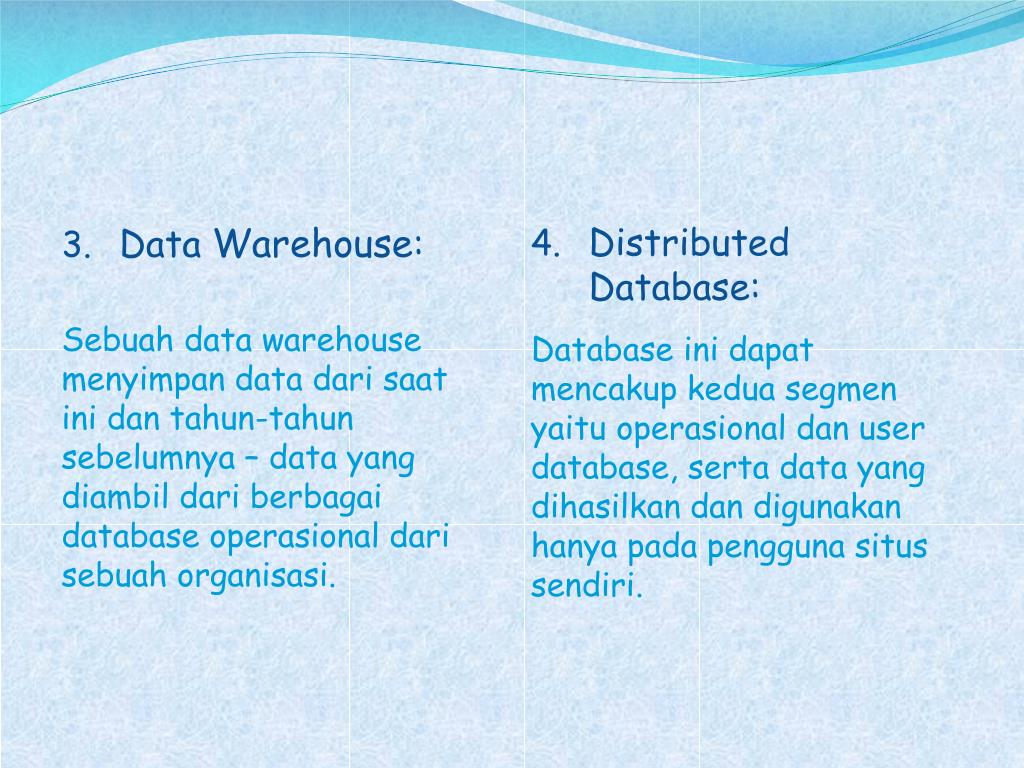 Data Warehouse: Sebuah data warehouse menyimpan data darisaatinidantahun-tahunsebelumnya – data yang diambildariberbagai database operasionaldarisebuahorganisasi. • Distributed Database: Database inidapatmencakupkeduasegmenyaituoperasionaldan user database, serta data yang dihasilkandandigunakanhanyapadapenggunasitussendiri.