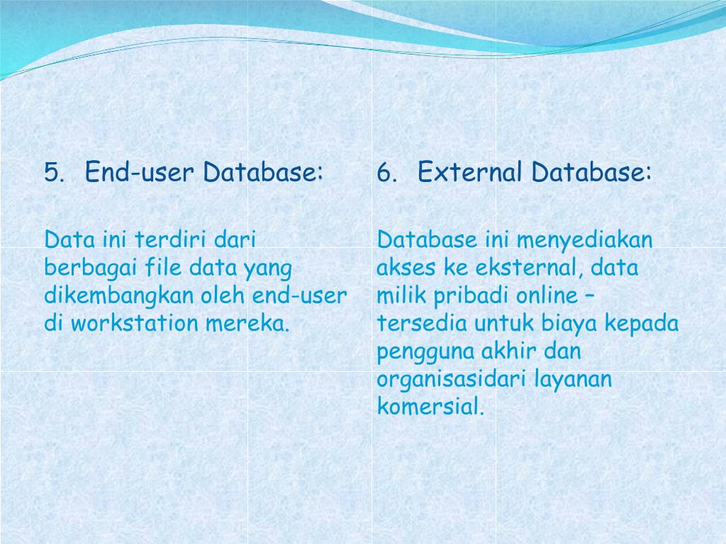 End-user Database: Data initerdiridariberbagai file data yang dikembangkanoleh end-user di workstation mereka. • External Database: Database inimenyediakanakseskeeksternal, data milikpribadi online – tersediauntukbiayakepadapenggunaakhirdanorganisasidarilayanankomersial.