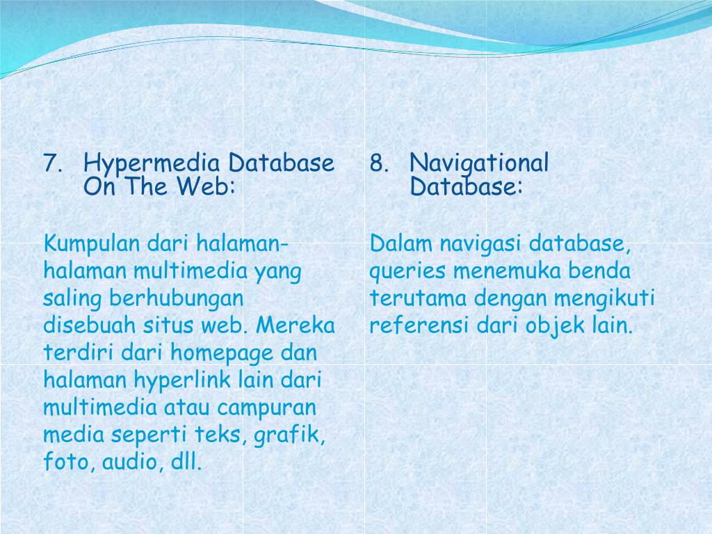 Hypermedia Database On The Web: Kumpulan darihalaman-halaman multimedia yang salingberhubungandisebuahsitus web. Merekaterdiridari homepage danhalaman hyperlink lain dari multimedia ataucampuran media sepertiteks, grafik, foto, audio, dll. • Navigational Database: Dalamnavigasi database, queries menemukabendaterutamadenganmengikutireferensidariobjek lain.
