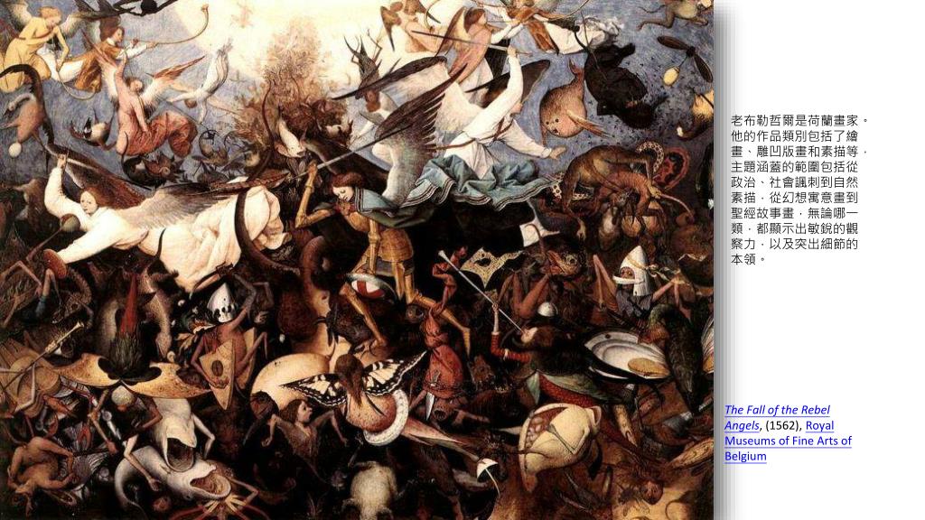 老布勒哲爾是荷蘭畫家。他的作品類別包括了繪畫、雕凹版畫和素描等,主題涵蓋的範圍包括從政治、社會諷刺到自然素描,從幻想寓意畫到聖經故事畫,無論哪一類,都顯示出敏銳的觀察力,以及突出細節的本領。老布勒哲爾是荷蘭畫家。他的作品類別包括了繪畫、雕凹版畫和素描等,主題涵蓋的範圍包括從政治、社會諷刺到自然素描,從幻想寓意畫到聖經故事畫,無論哪一類,都顯示出敏銳的觀察力,以及突出細節的本領。 The Fall of the Rebel Angels, (1562), Royal Museums of Fine Arts of Belgium