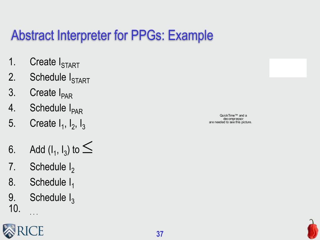 Create ISTART Schedule ISTART Create IPAR Schedule IPAR Create I1, I2, I3 Add (I1, I3) to Schedule I2 Schedule I1 Schedule I3 . . . Abstract Interpreter for PPGs: Example