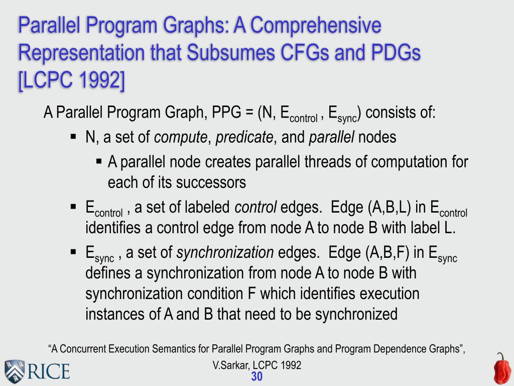 A Parallel Program Graph, PPG = (N, Econtrol , Esync) consists of: N, a set of compute, predicate, and parallel nodes A parallel node creates parallel threads of computation for each of its successors Econtrol , a set of labeled control edges. Edge (A,B,L) in Econtrol identifies a control edge from node A to node B with label L. Esync , a set of synchronization edges. Edge (A,B,F) in Esync defines a synchronization from node A to node B with synchronization condition F which identifies execution instances of A and B that need to be synchronized Parallel Program Graphs: A Comprehensive Representation that Subsumes CFGs and PDGs [LCPC 1992] “A Concurrent Execution Semantics for Parallel Program Graphs and Program Dependence Graphs”, V.Sarkar, LCPC 1992