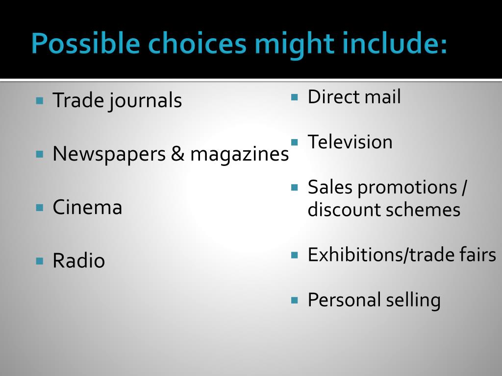 Possible choices might include: • Trade journals • Newspapers & magazines • Cinema • Radio Direct mail Television Sales promotions / discount schemes Exhibitions/trade fairs Personal selling