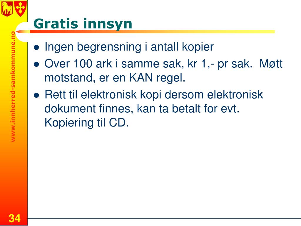 Bakgrunn for ny lov • HENSYNET BAK ER INNSYNSRETTEN Sivilombudsmannen undersøkte i 1997 praktiseringen av loven og konkluderte med ”at viljen til å utvise meroffentlighet ikke har vært sterk nok” • Bakgrunnen for ny lov er større åpenhet. • Krav om ny lov kom etter en undersøkelse bl.a. i 2 store norske kommuner.