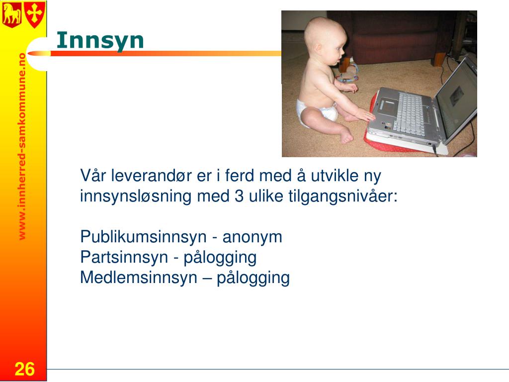 Innsyn Vår leverandør er i ferd med å utvikle ny innsynsløsning med 3 ulike tilgangsnivåer: Publikumsinnsyn - anonym Partsinnsyn - pålogging Medlemsinnsyn – pålogging