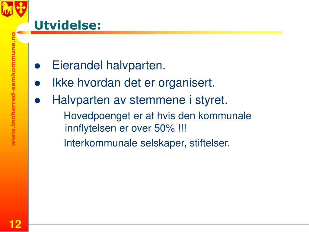 Utvidelse: • Eierandel halvparten. • Ikke hvordan det er organisert. • Halvparten av stemmene i styret. Hovedpoenget er at hvis den kommunale innflytelsen er over 50% !!! Interkommunale selskaper, stiftelser.