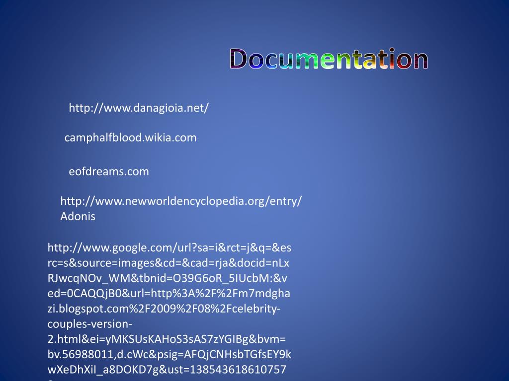 Documentation http://www.danagioia.net/ camphalfblood.wikia.com eofdreams.com http://www.newworldencyclopedia.org/entry/Adonis http://www.google.com/url?sa=i&rct=j&q=&esrc=s&source=images&cd=&cad=rja&docid=nLxRJwcqNOv_WM&tbnid=O39G6oR_5IUcbM:&ved=0CAQQjB0&url=http%3A%2F%2Fm7mdghazi.blogspot.com%2F2009%2F08%2Fcelebrity-couples-version-2.html&ei=yMKSUsKAHoS3sAS7zYGIBg&bvm=bv.56988011,d.cWc&psig=AFQjCNHsbTGfsEY9kwXeDhXiI_a8DOKD7g&ust=1385436186107573