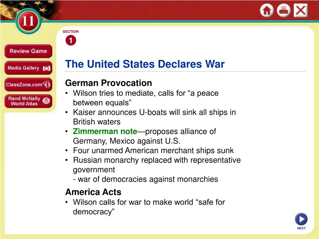 SECTION 1 The United States Declares War German Provocation • Wilson tries to mediate, calls for “a peace between equals” • Kaiser announces U-boats will sink all ships in British waters • Zimmerman note—proposes alliance of Germany, Mexico against U.S. • Four unarmed American merchant ships sunk • Russian monarchy replaced with representative government - war of democracies against monarchies America Acts • Wilson calls for war to make world “safe for democracy” NEXT