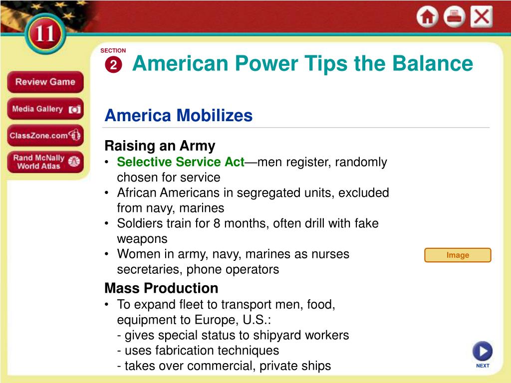 SECTION 2 Image American Power Tips the Balance America Mobilizes Raising an Army • Selective Service Act—men register, randomly chosen for service • African Americans in segregated units, excluded from navy, marines • Soldiers train for 8 months, often drill with fake weapons • Women in army, navy, marines as nurses secretaries, phone operators Mass Production • To expand fleet to transport men, food, equipment to Europe, U.S.: - gives special status to shipyard workers - uses fabrication techniques - takes over commercial, private ships NEXT
