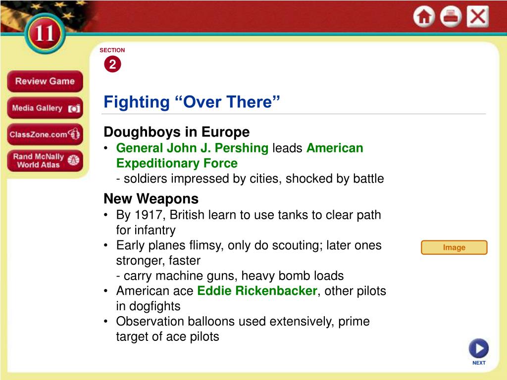 SECTION 2 Image Fighting “Over There” Doughboys in Europe • General John J. Pershing leads American Expeditionary Force - soldiers impressed by cities, shocked by battle • New Weapons • By 1917, British learn to use tanks to clear path for infantry • Early planes flimsy, only do scouting; later ones stronger, faster • - carry machine guns, heavy bomb loads • American ace Eddie Rickenbacker, other pilots in dogfights • Observation balloons used extensively, prime target of ace pilots NEXT