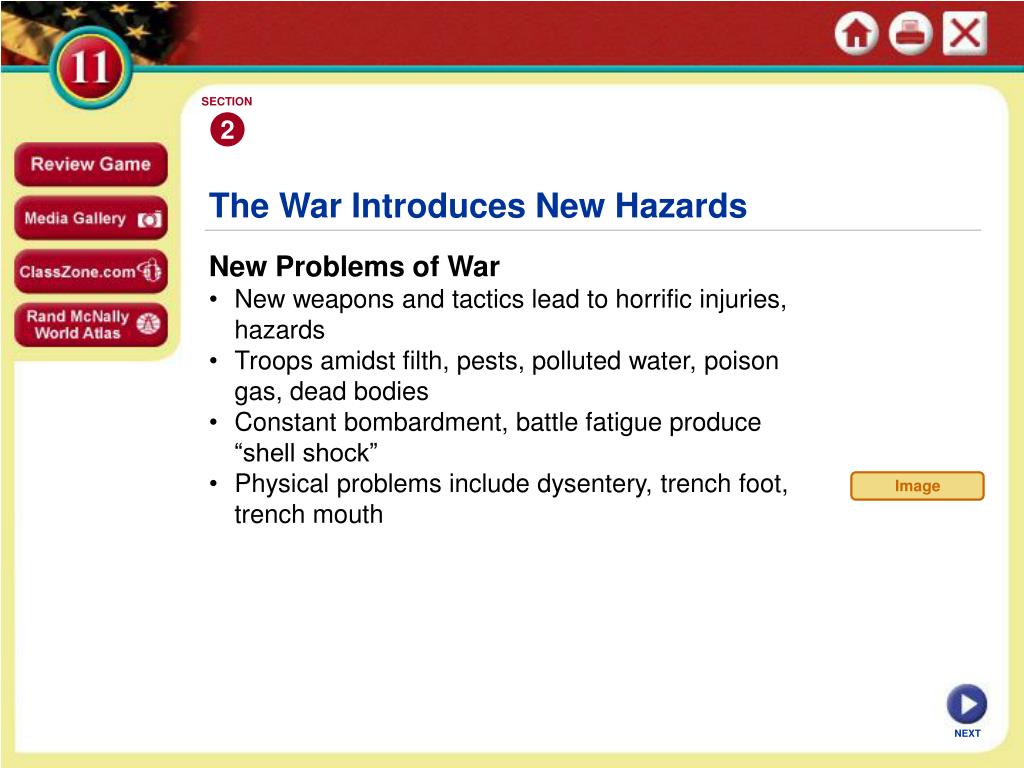 SECTION 2 Image The War Introduces New Hazards • New Problems of War • New weapons and tactics lead to horrific injuries, hazards • Troops amidst filth, pests, polluted water, poison gas, dead bodies • Constant bombardment, battle fatigue produce “shell shock” • Physical problems include dysentery, trench foot, trench mouth NEXT