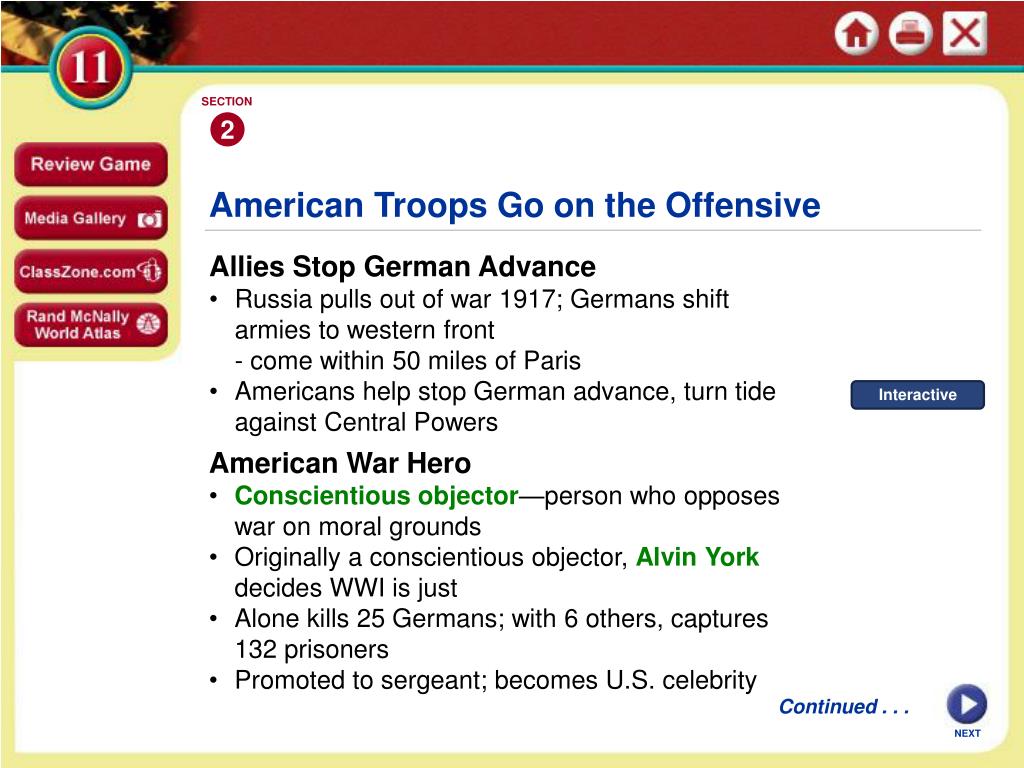 SECTION 2 Interactive American Troops Go on the Offensive Allies Stop German Advance • Russia pulls out of war 1917; Germans shift armies to western front - come within 50 miles of Paris • Americans help stop German advance, turn tide against Central Powers American War Hero • Conscientious objector—person who opposes war on moral grounds • Originally a conscientious objector, Alvin York decides WWI is just • Alone kills 25 Germans; with 6 others, captures 132 prisoners • Promoted to sergeant; becomes U.S. celebrity Continued . . . NEXT