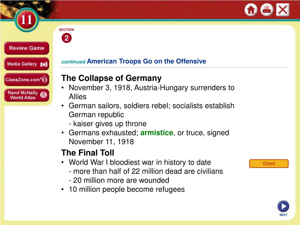 SECTION 2 Chart continuedAmerican Troops Go on the Offensive • The Collapse of Germany • November 3, 1918, Austria-Hungary surrenders to Allies • German sailors, soldiers rebel; socialists establish German republic • - kaiser gives up throne • Germans exhausted; armistice, or truce, signed November 11, 1918 • The Final Toll • World War I bloodiest war in history to date • - more than half of 22 million dead are civilians • - 20 million more are wounded • 10 million people become refugees NEXT