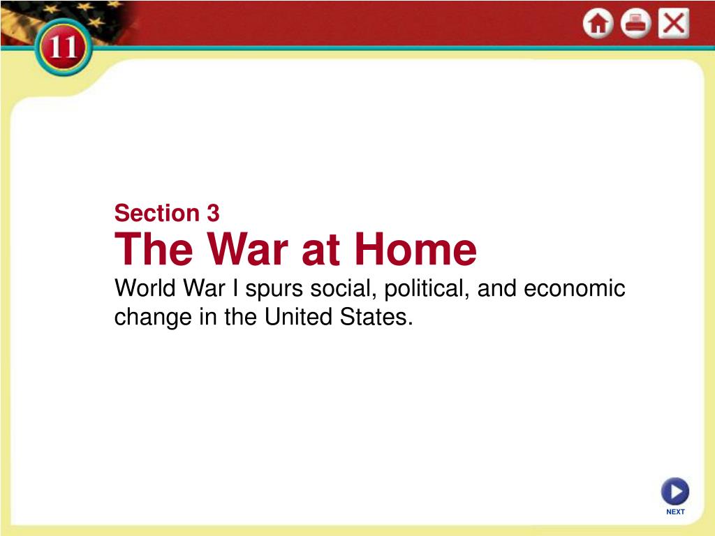 Section 3 The War at Home World War I spurs social, political, and economic change in the United States. NEXT
