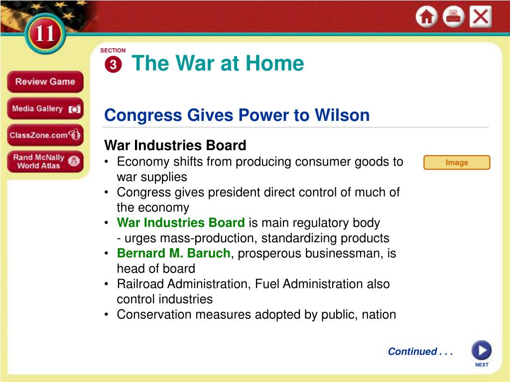 SECTION 3 Image The War at Home Congress Gives Power to Wilson War Industries Board • Economy shifts from producing consumer goods to war supplies • Congress gives president direct control of much of the economy • War Industries Board is main regulatory body - urges mass-production, standardizing products • Bernard M. Baruch, prosperous businessman, is head of board • Railroad Administration, Fuel Administration also control industries • Conservation measures adopted by public, nation Continued . . . NEXT