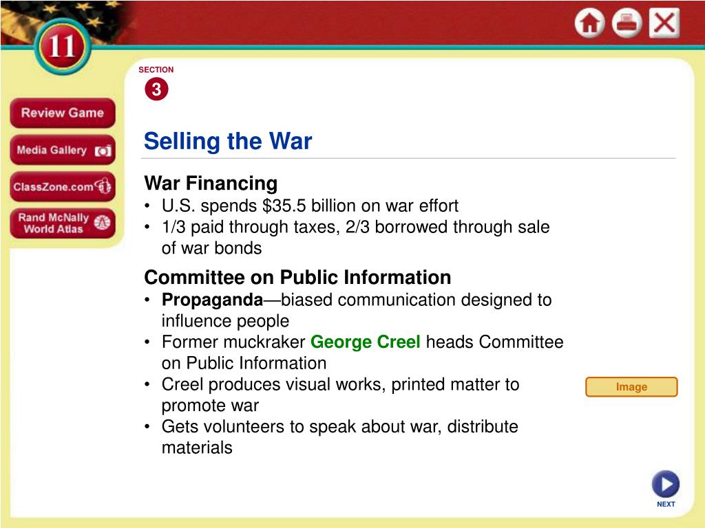 SECTION 3 Image Selling the War • War Financing • U.S. spends $35.5 billion on war effort • 1/3 paid through taxes, 2/3 borrowed through sale of war bonds • Committee on Public Information • Propaganda—biased communication designed to influence people • Former muckraker George Creel heads Committee on Public Information • Creel produces visual works, printed matter to promote war • Gets volunteers to speak about war, distribute materials NEXT