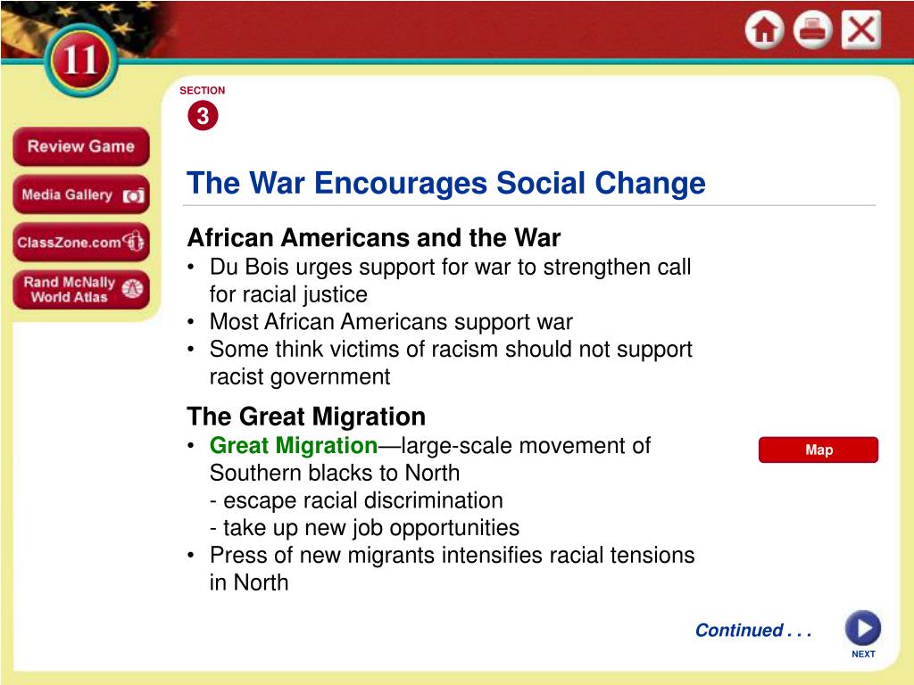 SECTION 3 Map The War Encourages Social Change • African Americans and the War • Du Bois urges support for war to strengthen call for racial justice • Most African Americans support war • Some think victims of racism should not support racist government The Great Migration • Great Migration—large-scale movement of Southern blacks to North - escape racial discrimination - take up new job opportunities • Press of new migrants intensifies racial tensions in North Continued . . . NEXT