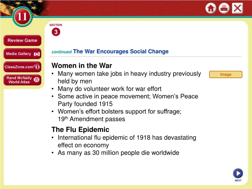 SECTION 3 Image continuedThe War Encourages Social Change • Women in the War • Many women take jobs in heavy industry previously held by men • Many do volunteer work for war effort • Some active in peace movement; Women’s Peace Party founded 1915 • Women’s effort bolsters support for suffrage; 19th Amendment passes • The Flu Epidemic • International flu epidemic of 1918 has devastating effect on economy • As many as 30 million people die worldwide NEXT