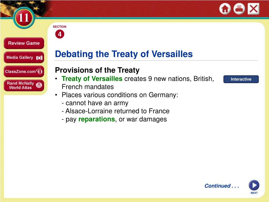 SECTION 4 Interactive Debating the Treaty of Versailles Provisions of the Treaty • Treaty of Versailles creates 9 new nations, British, French mandates • Places various conditions on Germany: - cannot have an army - Alsace-Lorraine returned to France - pay reparations, or war damages Continued . . . NEXT