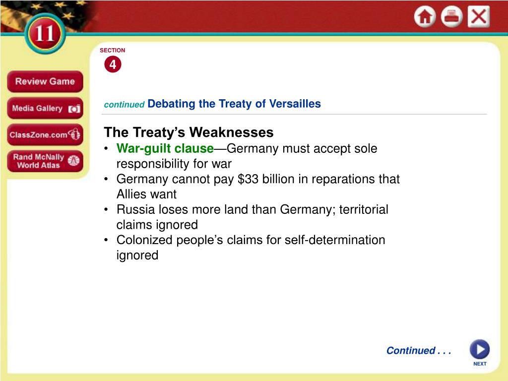SECTION 4 continuedDebating the Treaty of Versailles The Treaty’s Weaknesses • War-guilt clause—Germany must accept sole responsibility for war • Germany cannot pay $33 billion in reparations that Allies want • Russia loses more land than Germany; territorial claims ignored • Colonized people’s claims for self-determination ignored Continued . . . NEXT