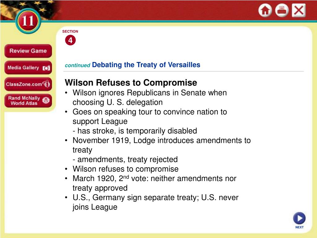 SECTION 4 continuedDebating the Treaty of Versailles • Wilson Refuses to Compromise • Wilson ignores Republicans in Senate when choosing U. S. delegation • Goes on speaking tour to convince nation to support League • - has stroke, is temporarily disabled • November 1919, Lodge introduces amendments to treaty • - amendments, treaty rejected • Wilson refuses to compromise • March 1920, 2nd vote: neither amendments nor treaty approved • U.S., Germany sign separate treaty; U.S. never joins League NEXT