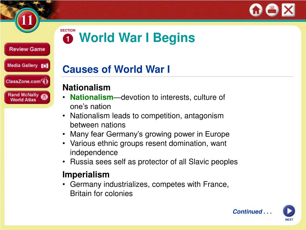 SECTION 1 World War I Begins Causes of World War I Nationalism • Nationalism—devotion to interests, culture of one’s nation • Nationalism leads to competition, antagonism between nations • Many fear Germany’s growing power in Europe • Various ethnic groups resent domination, want independence • Russia sees self as protector of all Slavic peoples Imperialism • Germany industrializes, competes with France, Britain for colonies Continued . . . NEXT