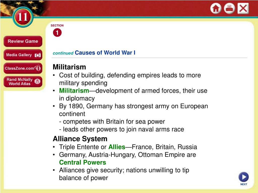 SECTION 1 continuedCauses of World War I Militarism • Cost of building, defending empires leads to more military spending • Militarism—development of armed forces, their use in diplomacy • By 1890, Germany has strongest army on European continent - competes with Britain for sea power - leads other powers to join naval arms race • Alliance System • Triple Entente or Allies—France, Britain, Russia • Germany, Austria-Hungary, Ottoman Empire are Central Powers • Alliances give security; nations unwilling to tip balance of power NEXT