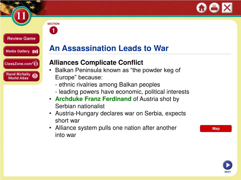 SECTION 1 Map An Assassination Leads to War Alliances Complicate Conflict • Balkan Peninsula known as “the powder keg of Europe” because: - ethnic rivalries among Balkan peoples - leading powers have economic, political interests • Archduke Franz Ferdinand of Austria shot by Serbian nationalist • Austria-Hungary declares war on Serbia, expects short war • Alliance system pulls one nation after another into war NEXT