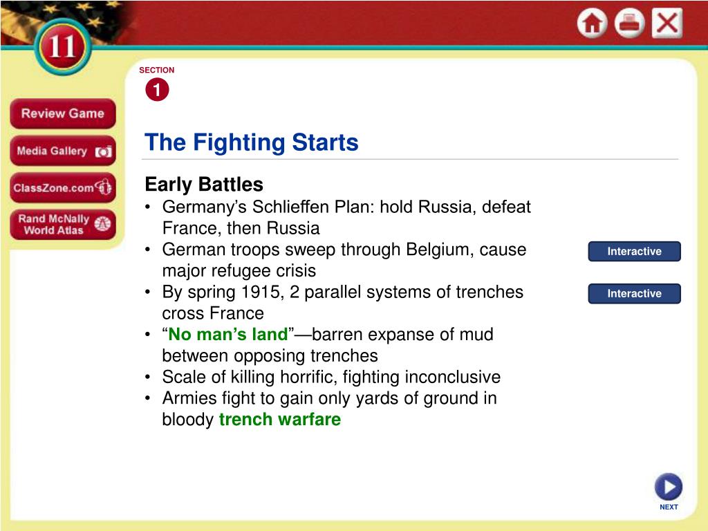 SECTION 1 Interactive Interactive The Fighting Starts • Early Battles • Germany’s Schlieffen Plan: hold Russia, defeat France, then Russia • German troops sweep through Belgium, cause major refugee crisis • By spring 1915, 2 parallel systems of trenches cross France • “No man’s land”—barren expanse of mud between opposing trenches • Scale of killing horrific, fighting inconclusive • Armies fight to gain only yards of ground in bloody trench warfare NEXT