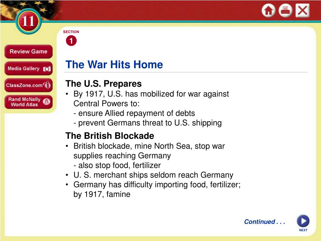 SECTION 1 The War Hits Home The U.S. Prepares • By 1917, U.S. has mobilized for war against Central Powers to: - ensure Allied repayment of debts - prevent Germans threat to U.S. shipping The British Blockade • British blockade, mine North Sea, stop war supplies reaching Germany - also stop food, fertilizer • U. S. merchant ships seldom reach Germany • Germany has difficulty importing food, fertilizer; by 1917, famine Continued . . . NEXT