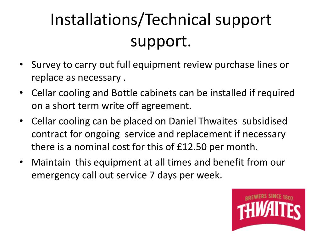 Installations/Technical support support. • Survey to carry out full equipment review purchase lines or replace as necessary . • Cellar cooling and Bottle cabinets can be installed if required on a short term write off agreement. • Cellar cooling can be placed on Daniel Thwaites subsidised contract for ongoing service and replacement if necessary there is a nominal cost for this of £12.50 per month. • Maintain this equipment at all times and benefit from our emergency call out service 7 days per week.